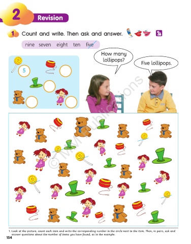 1. Look at the picture, count each item and write the corresponding number in the circle next to the item. Then, in pairs, ask and