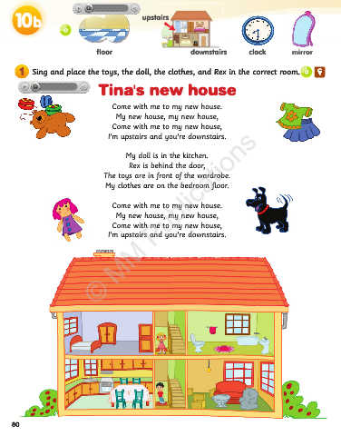 1 Sing and place the toys, the doll, the clothes, and Rex in the correct room.